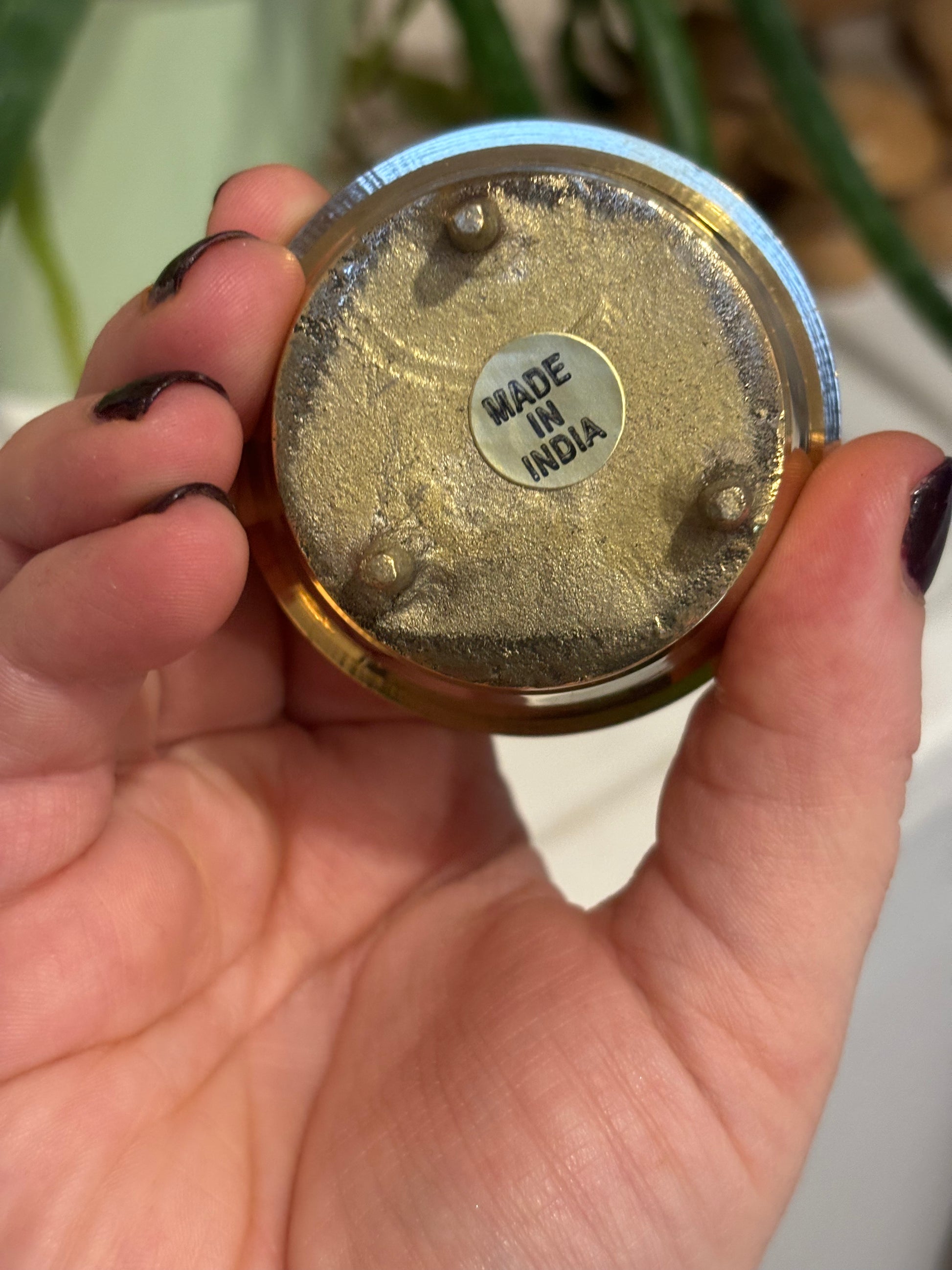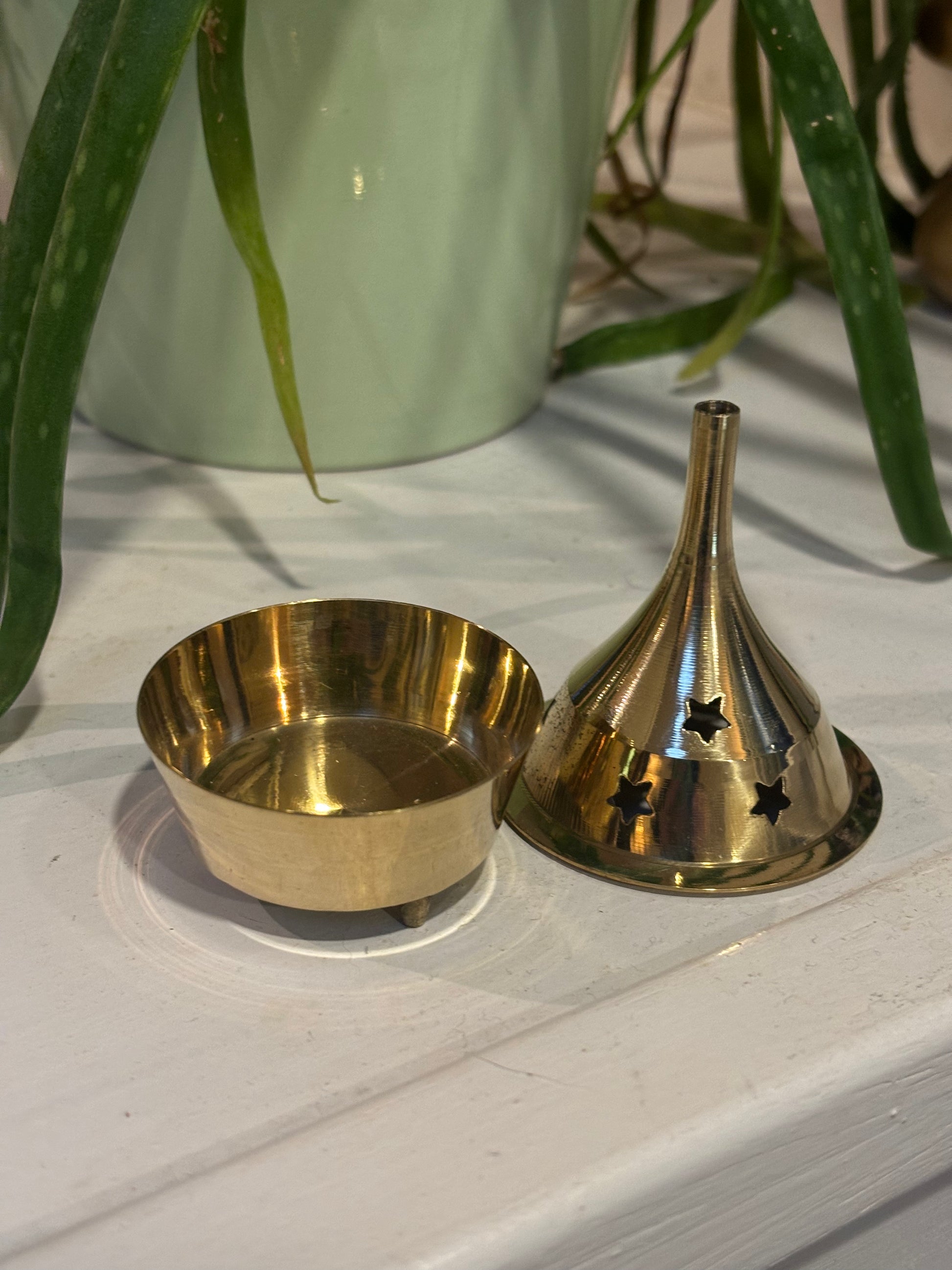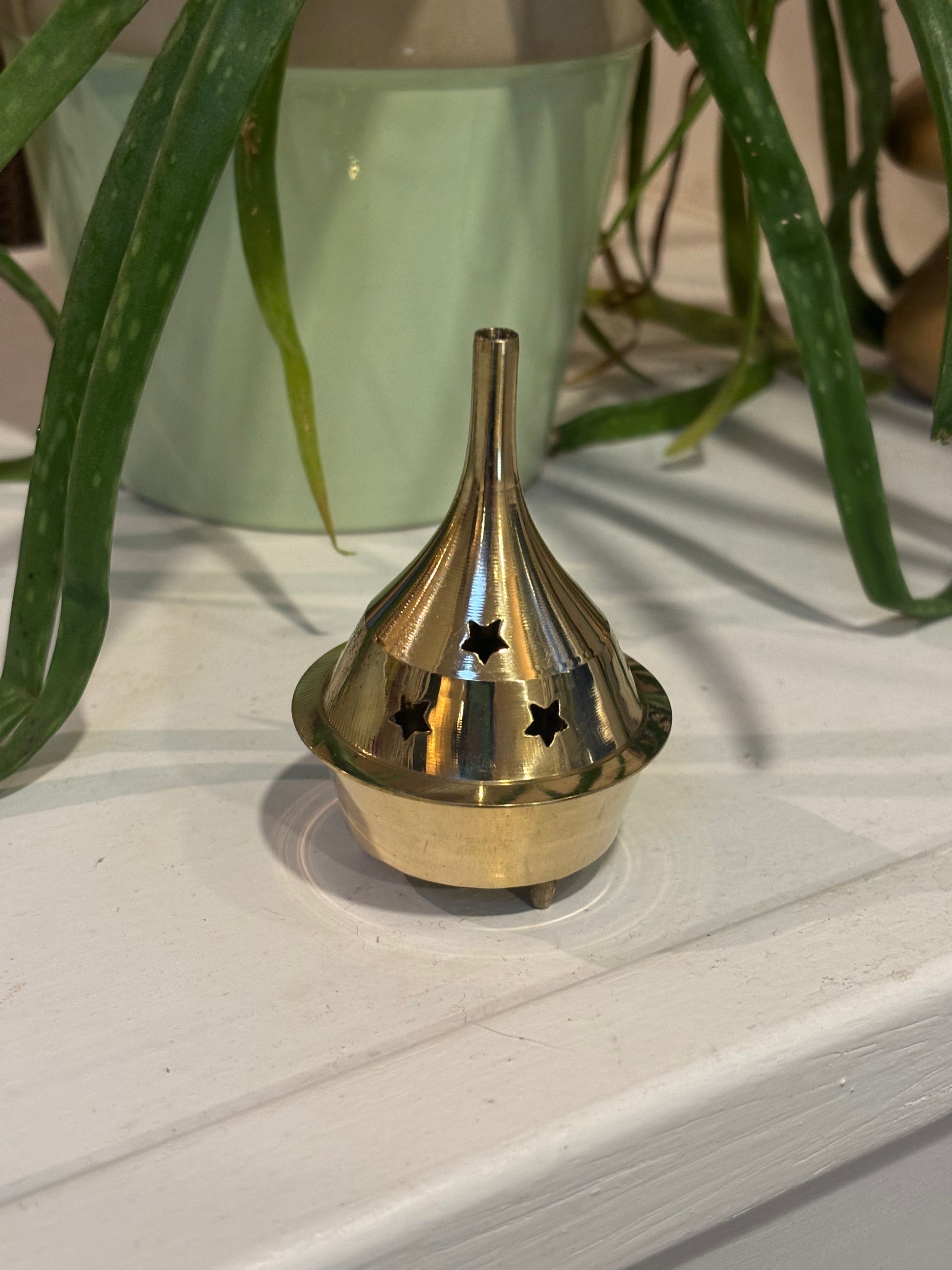 Brass burner with a funnel shaped lid with star shaped holes and a base with 3 legs to stand. Can be used for the burning of incense resins or cones, or for charcoal discs. Made in India