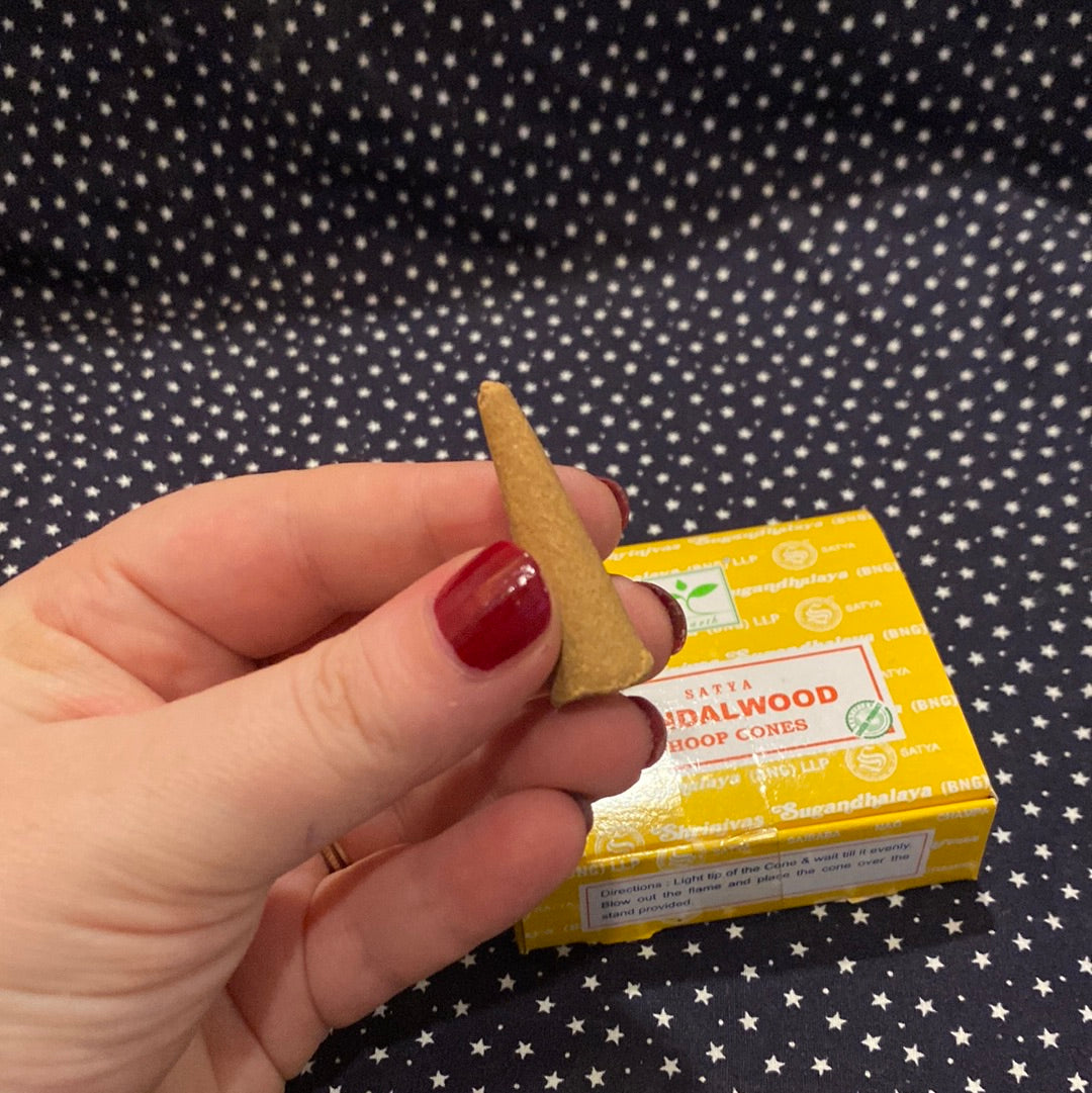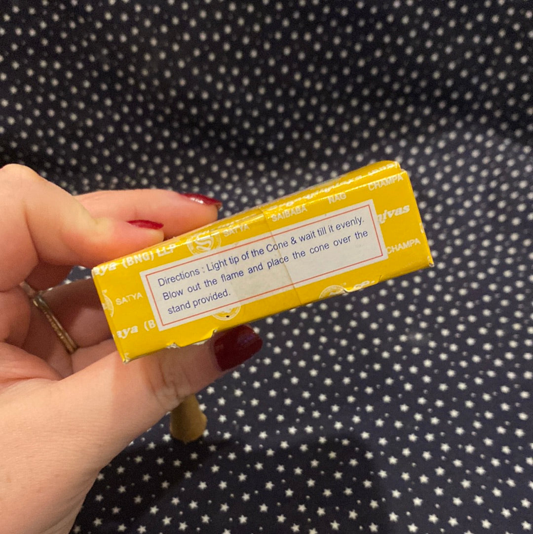 Simply light the tip of the incense cone until it glows red, then blow out the flame and place on the holder provided or another suitable holder.