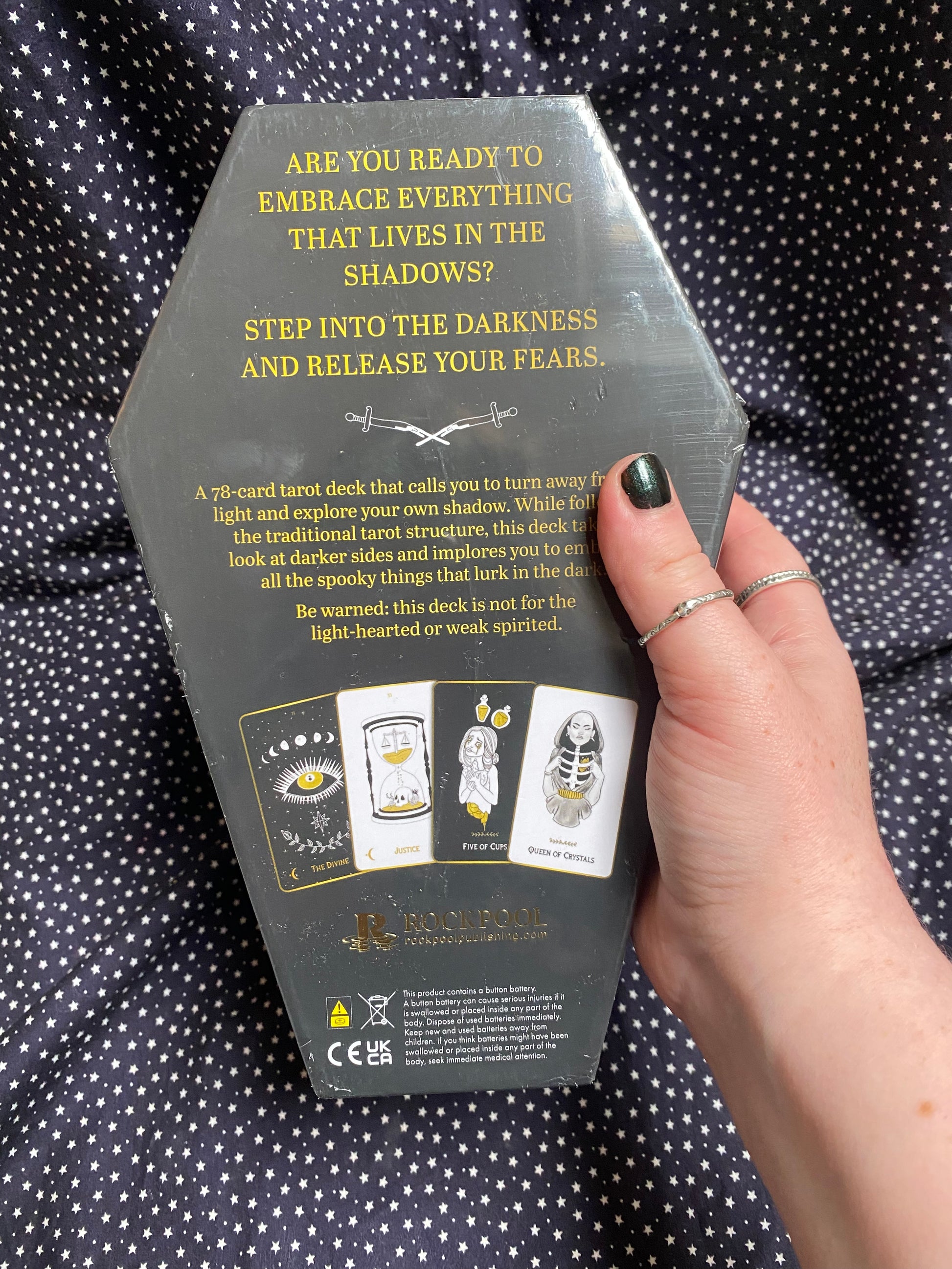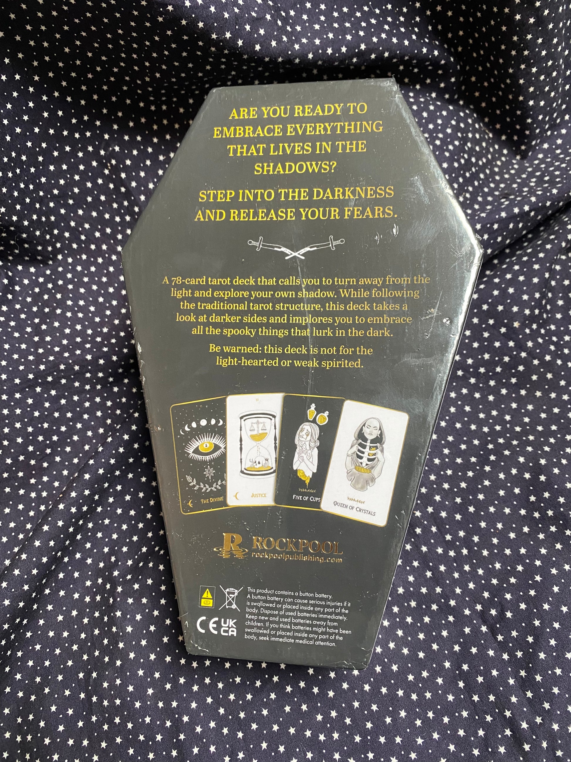 A 78-card tarot deck that calls you to turn away from the light and explore your own shadow; includes a 22-card major arcana and 4 minor arcana suits. Also included is a detailed guidebook. While following the traditional tarot structure, the deck takes a look at the darker sides of the cards and implores you to embrace all the spooky things that lurk in the dark. You will be pushed down the rabbit hole of your own psyche and forced to face your darkest thoughts.